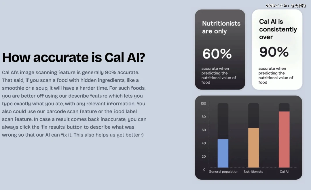 2020 年的一项研究发现一些比较流行的基于人工智能的卡路里计数器,发现最准确卡路里的准确率只有63%左右。