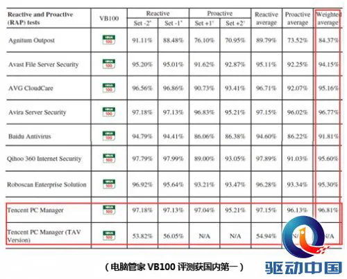 据VB100报告显示,此次评测共有29款杀毒软件参加,其中国内参测的杀毒软件有腾讯电脑管家(多引擎版和TAV引擎版)、360安全卫士、百度杀毒等。最终,腾讯电脑管家以最新病毒检出率96.81%、误报率零的成绩位列全球第二,国内第一,超过360安全卫士(95.60%)、百度杀毒(91.81%),并且稳定性也都高于国内其他参测软件。