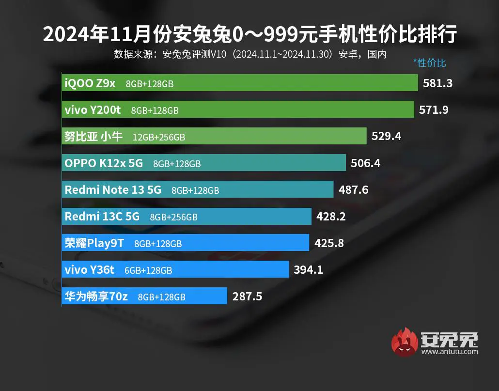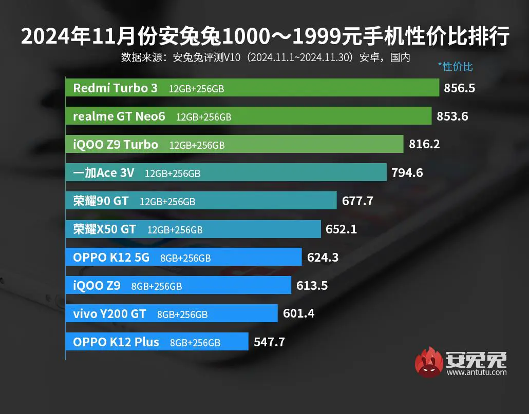 这里是给大家按价位节选的11月性价比榜单内容,有兴趣的朋友可以搜索安兔兔官网查看完整榜单。