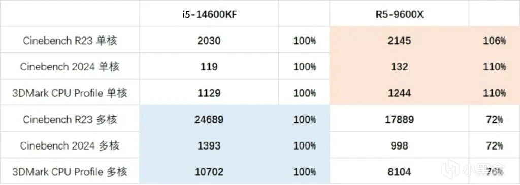 整体而言,凭借 Zen5 架构,9600X 的单核性能超过 14600KF 约 8%-10%,但 14600KF 依靠更多的核心数量,在多核性能上领先 25% 以上。