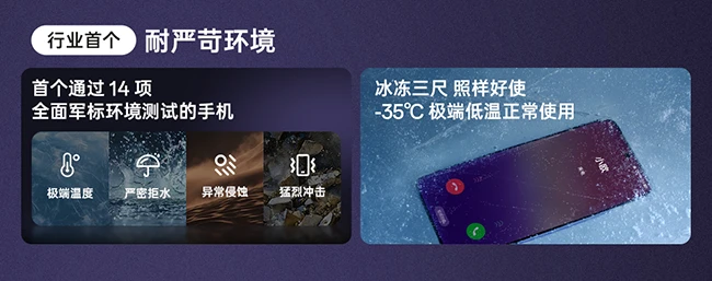 OPPO A5 Pro 还通过「14 项全方位军标环境测试」,不仅能在 -35℃ 到 47℃ 的极端温度下正常使用,还能防冰冻、防沙尘、防盐雾等恶劣环境,哪怕冰冻三尺,也照样好使。