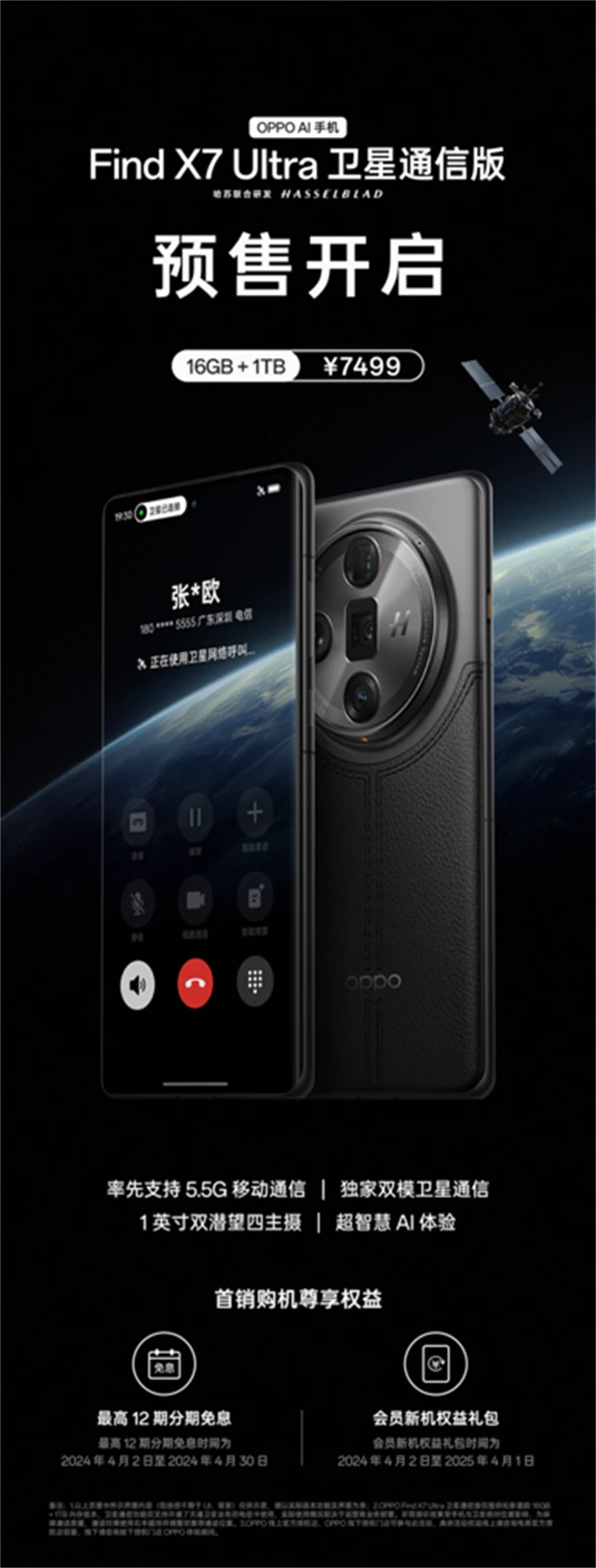 今日,OPPO 宣布 Find X7 Ultra 卫星通信版(16GB RAM+1TB ROM)今日正式开启预售,并将于4月2日全面开售。Find X7 Ultra 卫星通信版首次可以实现听筒/免提双模双向卫星通话,并率先支持新一代5.5G通信技术,提供天地融合的通信新体验。Find X7 Ultra 卫星通信版还为双潜望四主摄系统搭载升级的超光影图像引擎,以先进的大模型技术革新AI计算,带来全新的超清长焦能力,为10X以上的变焦拍摄带来真实解析力的量级提升。作为快速进化的AI手机,Find X7 Ultra 成为行业首款通过国家权威机构测试的AI手机,并带来全新的小布英语老师与小布面试官智能体。