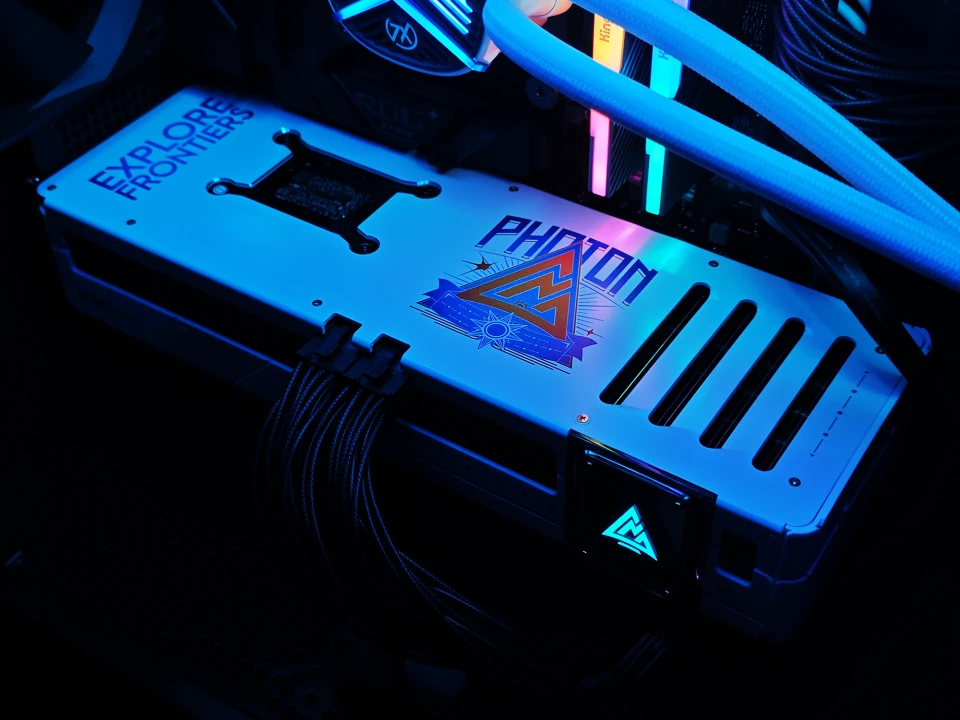 白色显卡搭配黑色主板形成经典的黑白配,当发光灯牌亮起那一刻,蓝戟B580 Photon就像一艘在茫茫宇宙中游弋的未来战舰。