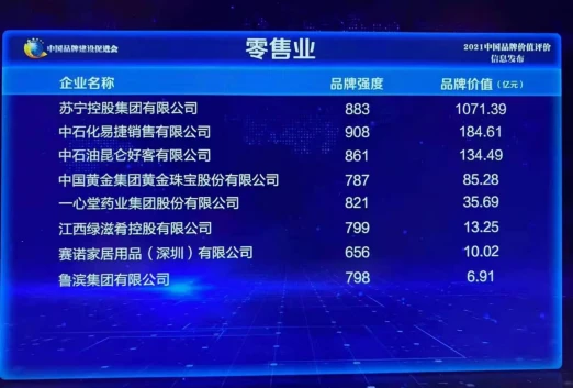 2021中国品牌价值评价信息5月9日在上海发布,苏宁集团以1071.39亿元的品牌价值高居零售业第一名,再度跻身千亿俱乐部。