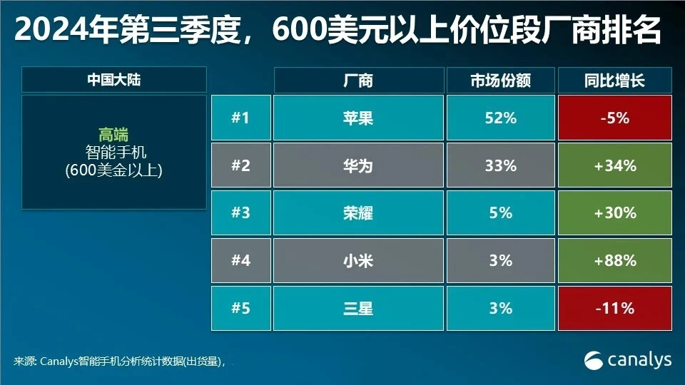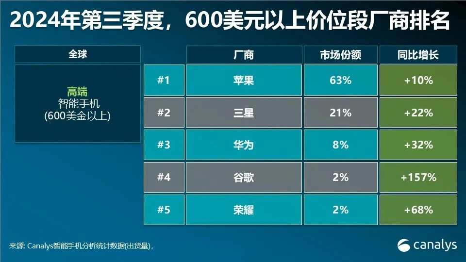 听够了周销量、月销量,今天来个季度销量统计:以下是来自调查机构关于2024年第三季度高端智能手机市场份额排名:
