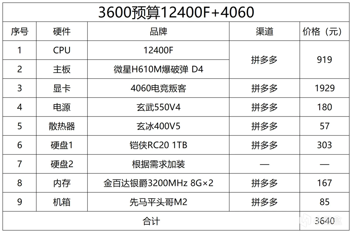3600预算推荐12400F+4060,游戏性能和5600+6750GRE 10G差不多,不过4060光追性能更强,玩3A游戏想体验光追就买4060,这套配置也是1080P分辨率乱杀,2K分辨率中高畅玩水平,主板的话换华硕H610M-E支持加装M.2,H610爆破弹只有1个M.2接口。