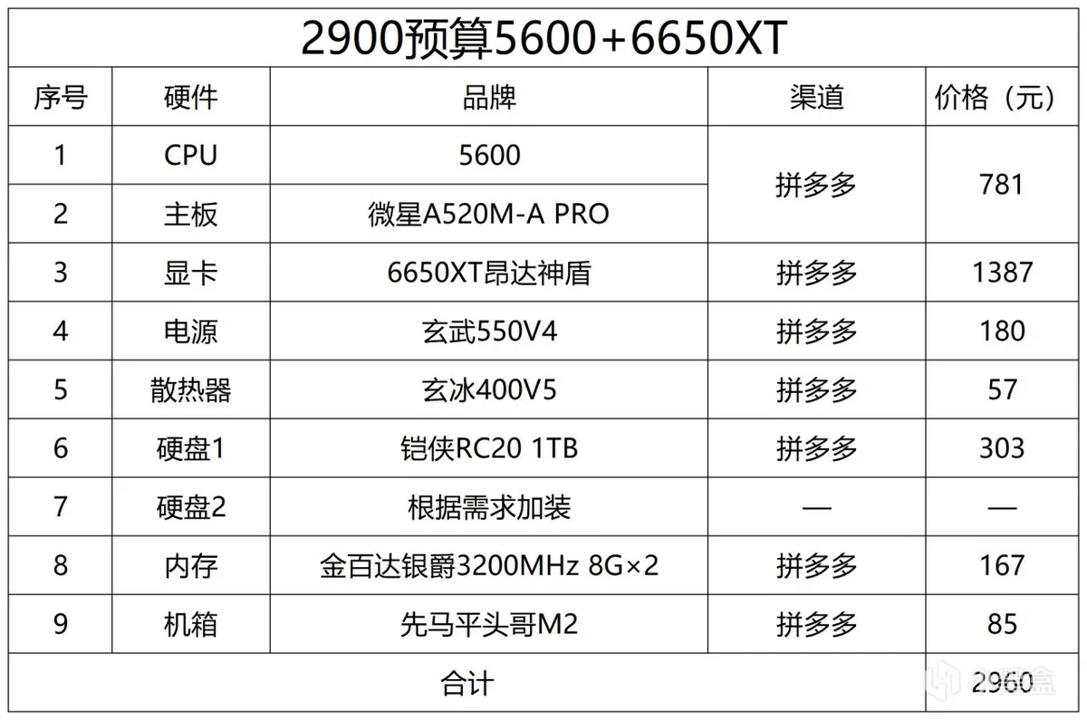 2900预算推荐5600+6650XT,这配置在1080P乱杀,2K分辨率也能带动,大部分3A游戏都可以中高画质畅玩,显卡用的最近昂达出了一批6650XT卖1300多性价比挺高的,如果没听过想换牌子可以换讯景黑狼贵200左右,标配16G内存+1TB固态,这个可以根据需求自行加装,电源选的是目前比较热门的玄武550K,散热上选择的是方便安装的玄冰400V5,机箱百元机箱自选就行。