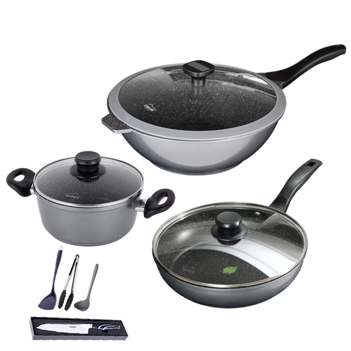 如果你正在寻找一套高品质的德国工艺锅具,STONELINE的阿尔卑斯山原石三件套将是你的理想选择。这款锅具采用阿尔卑斯山脉的天然原石,经过热贴面工艺处理,使其表面耐磨且抗刮。其30cm中炒锅、28cm平底锅和28cm炖锅的尺寸设计适合3-5人的家庭使用,无论是炒菜、煎牛排还是炖煮,都能轻松应对。