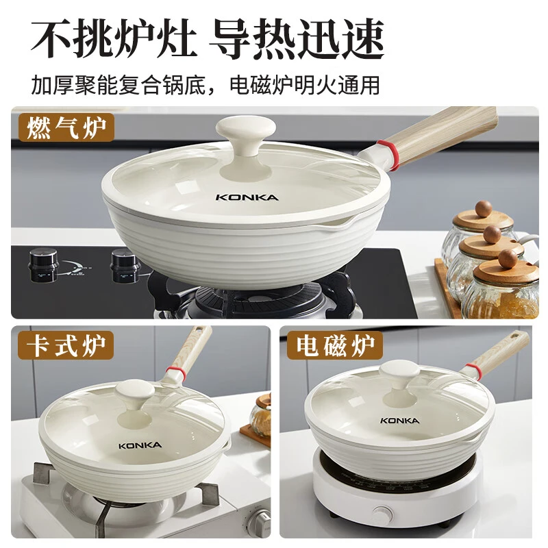 值得一提的是,这款炒锅的锅底采用了加厚聚能复合材料,导热迅速,可以让食材均匀受热,烹饪更加高效。而且,这款炒锅兼容各类炉灶,无论是燃气灶、电陶炉还是电磁炉,都可以使用,让你的厨房更加灵活多变。