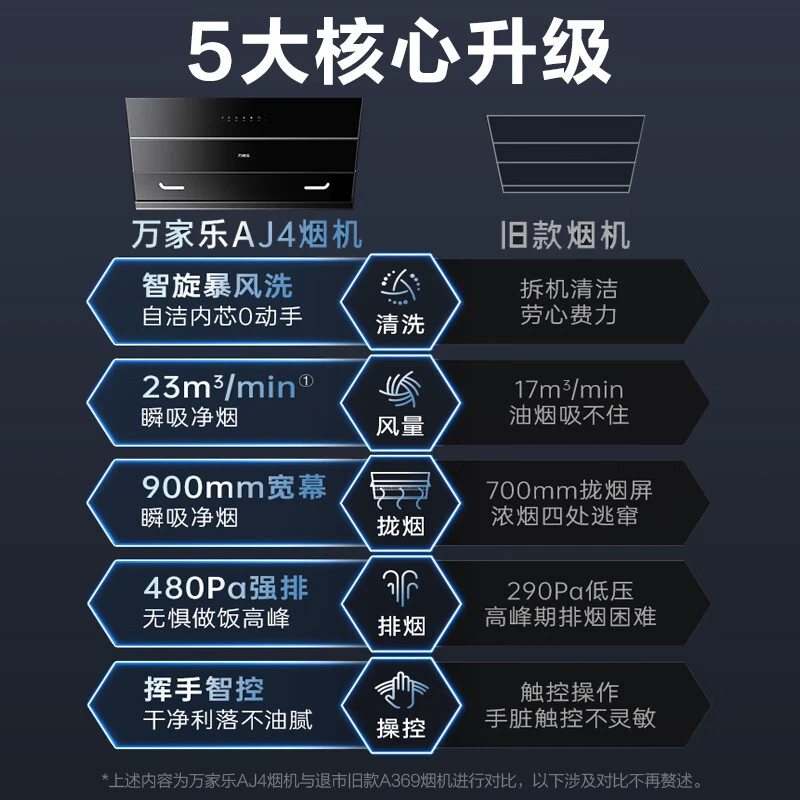 万家乐CXW-320-AJ4侧吸式抽油烟机,以23m3/min的大吸力,迅速捕捉油烟,保持厨房清新。900mm宽幅拢烟,配合85°自动开合角度,有效封锁油烟。480Pa强排,无惧高楼烹饪高峰期油烟倒灌。AI智洗功能,关机自启清洁,无需拆机,省时省力。