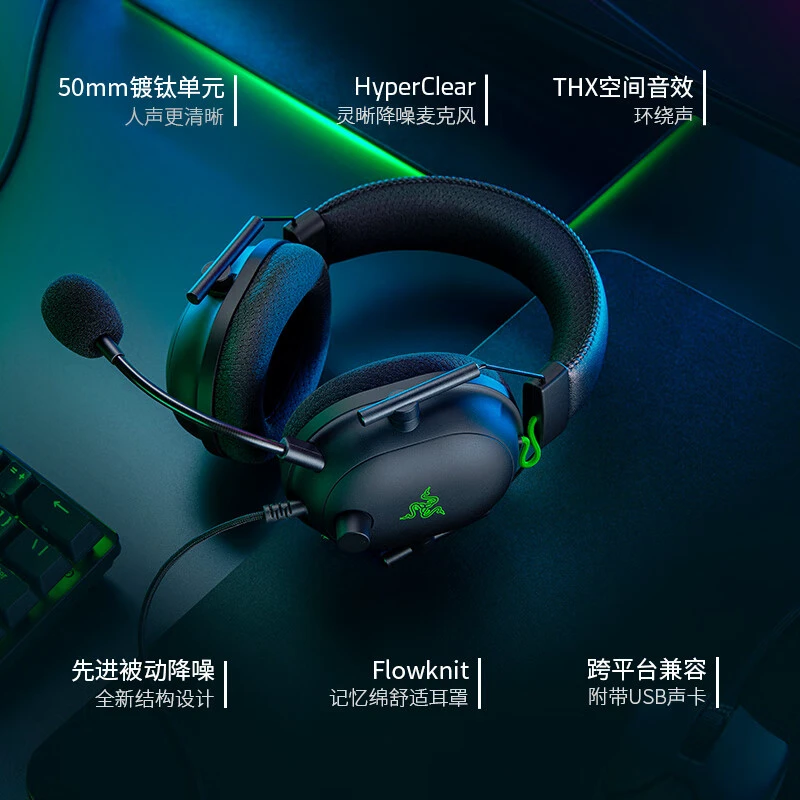 嘿,大家好,我是你们的老朋友。今天给大家介绍一款电竞耳机,雷蛇旋风黑鲨V2。这款耳机搭载了50mm镀钛驱动单元,针对高中低音三频进行了专业调校,音质清晰,高音丰富,低音强劲。配备了镀钛振膜,人声更清楚,战斗时沟通无障碍。