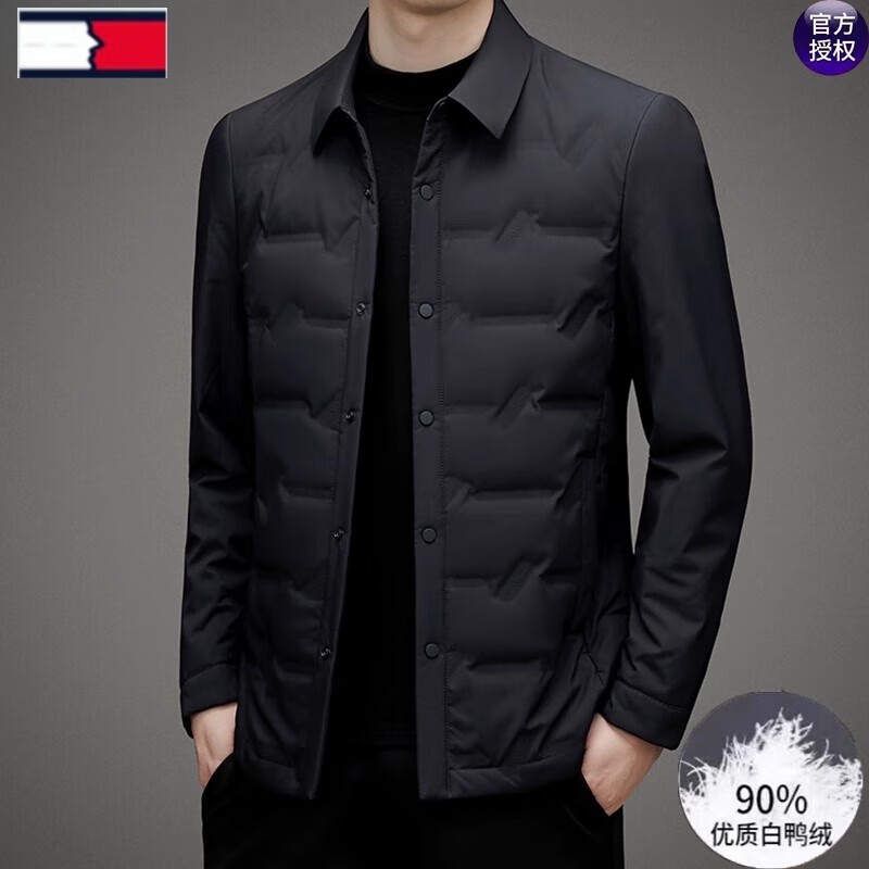 汤米希凯利男士羽绒服,黑色轻薄修身夹克,采用100%聚酯纤维面料,内填充90%白鸭绒,保暖性能卓越。多重锁绒技术,有效防止钻绒、漏绒,保持温暖。版型修身,适合冬季穿着,时尚又实用。尺码齐全,170-195可选,适合不同身高的男士。个人推荐这款羽绒服,保暖效果好,穿着舒适,简约大方,是冬季必备单品。