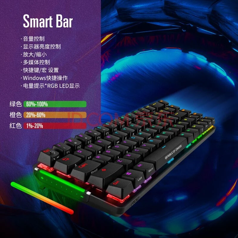 这款键盘的SmartBar触控条功能强大,能轻松控制音量和亮度,而且RGBLED电量显示非常实用。400小时的续航让我无需担心电量问题,即使在无灯模式下也能畅玩到底。