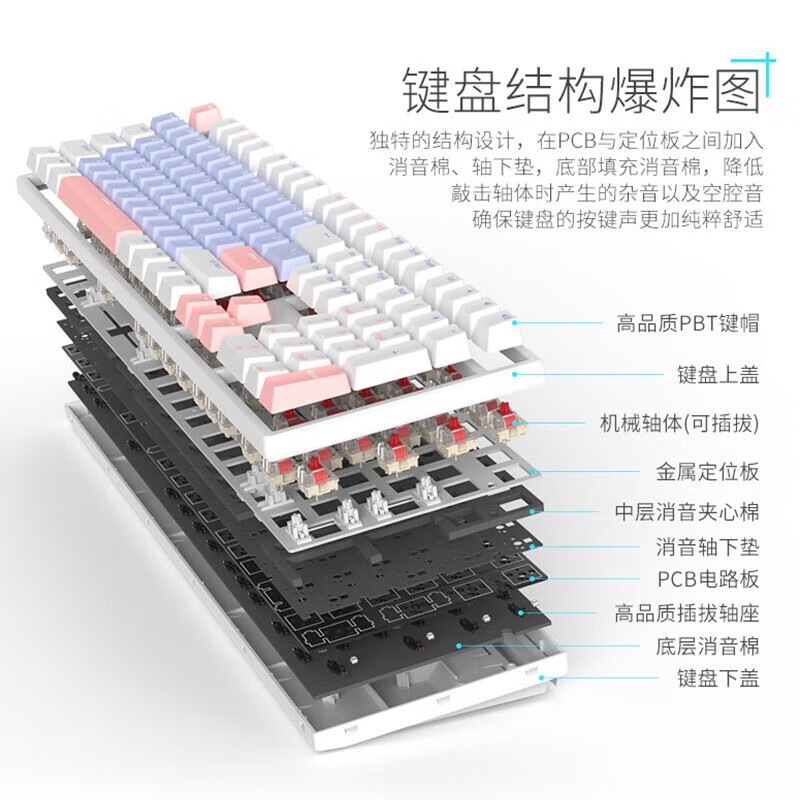 在硬件配置上,GANSS3087同样出色。键盘上盖采用金属定位板,中层配有消音夹心棉,轴下垫以及底层消音棉,有效降低敲击产生的杂音,确保按键声更加纯粹舒适。此外,热插拔轴座和双系统支持的设计,让你在使用过程中更加便捷。GANSSA粉轴和A黄轴的加入,为不同用户提供了更多选择,满足个性化需求。