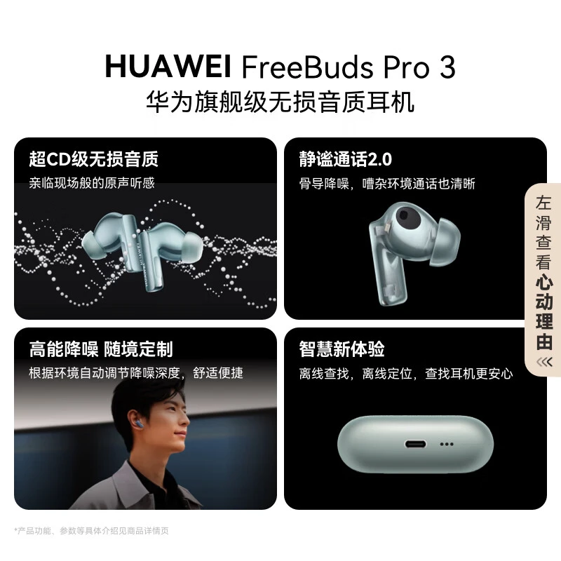 华为FreeBudsPro3龙年典藏版雅川青降噪耳机,真系正啊!自研麒麟A2芯片,音质、连接、通话、降噪全方位升级。传输速度提升4倍,8M蓝牙物理传输速率,音质超CD级无损,细节丰富,听歌就是一种享受。抗干扰能力提升2倍,信号稳如老狗。全球首款应用星闪连接技术,1.5Mbps无损传输,业界领先。
