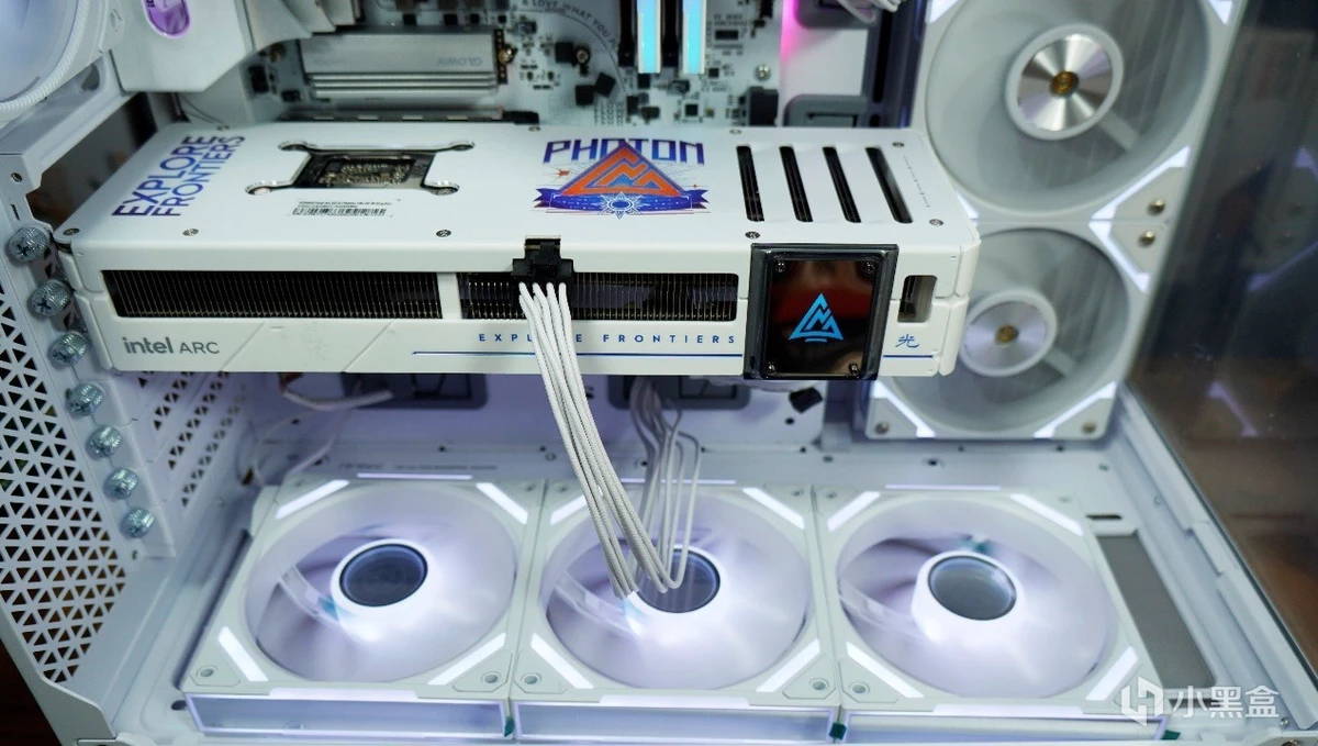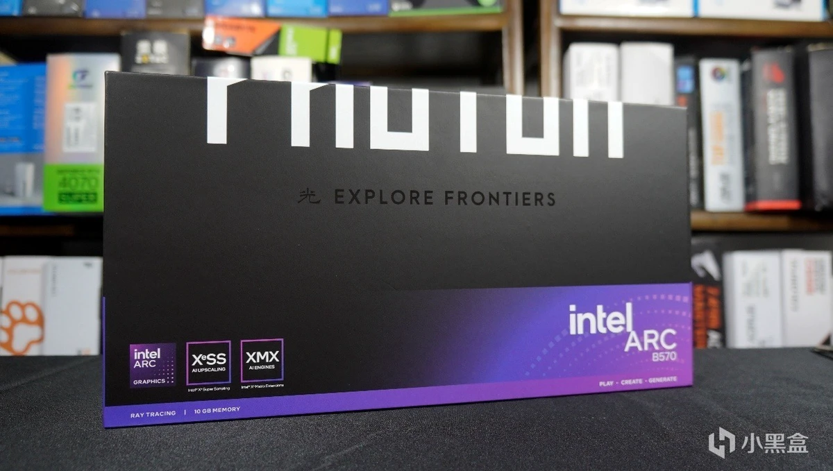 透过蓝戟B570 Photon 10GB顶部,我们可以看到散热器内部的散热鳍片,开孔面积不算小。左下角位置印有intel ARC字样,字体应该采用经典蓝色配色,右侧位置则是印有“EXPLORE FRONTIERS”和“光”字样。