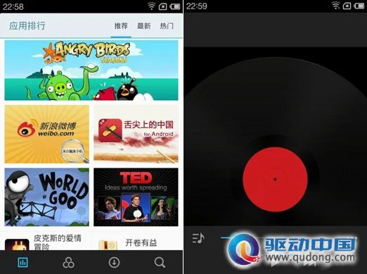 应用中心和音乐播放器界面