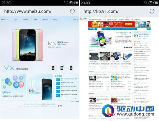 魅族自带浏览器布局简洁,较之前旧版的双核MX变化不大,但多标签页面的切换方式的效率提升是非常显而易见的,可以直接通过滑动进行页面切换。
