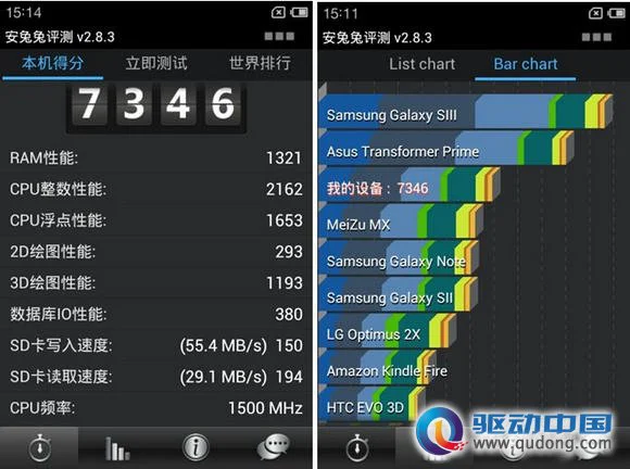 从上图测试可以显示出,在安兔兔评测下跑分为7346,在众多双核机型中已然位居第一,但相比于四核手机还是略显差距。