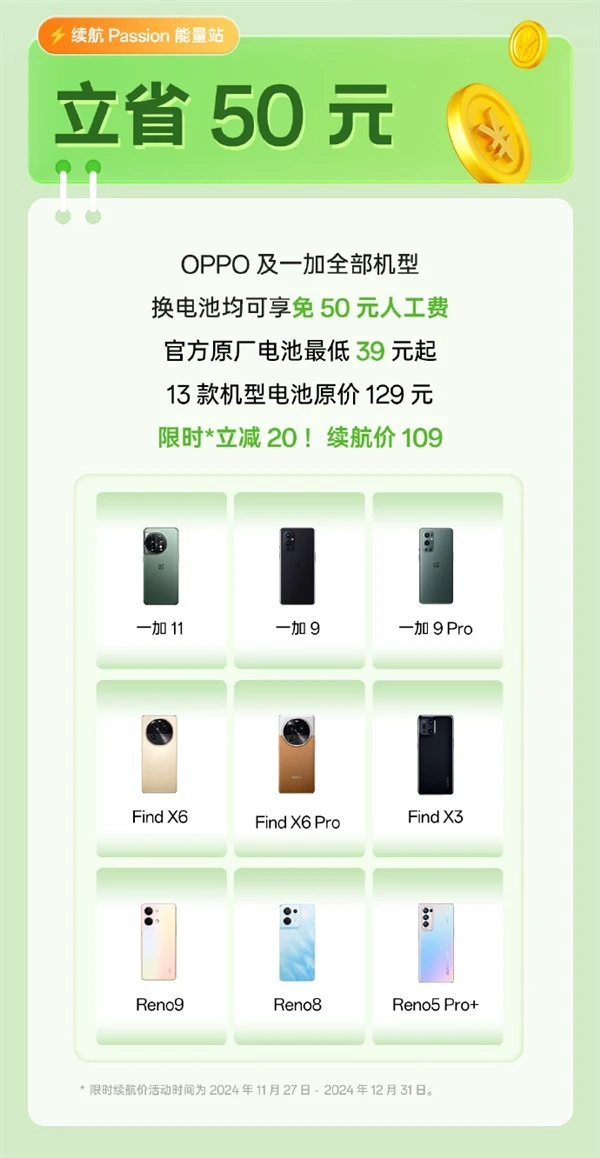 从即日起至2024年12月31日,OPPO、一加所有机型更换电池均可享受免50元人工费的优惠,让电池更换更加经济实惠。