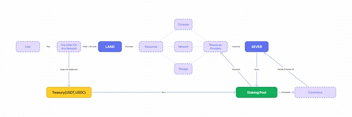 - 支付选项:用户可以选择将 $4EVER 兑换为 $LAND,并用它来支付服务费用,从而推动代币的流通和需求。