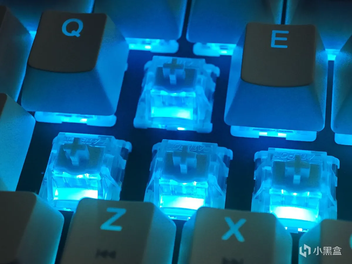 轴体的聚光镜圆弧处理,增加透光面积,灯光扩散更柔和,透光性能更好。升级3.0灯效,灯光投射更柔和,不刺眼,整体的RGB灯光氛围不错。