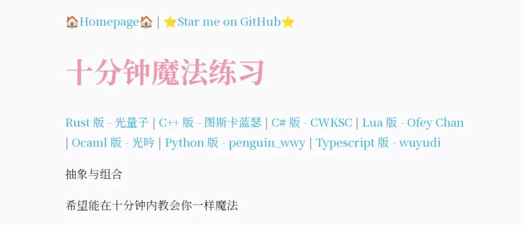 包含多个编程语言,Rust、C++、C#、Lua、Ocaml、Python等等,可以学习类型系统、计算理论、形式化演奏、编程范式和原理等内容。