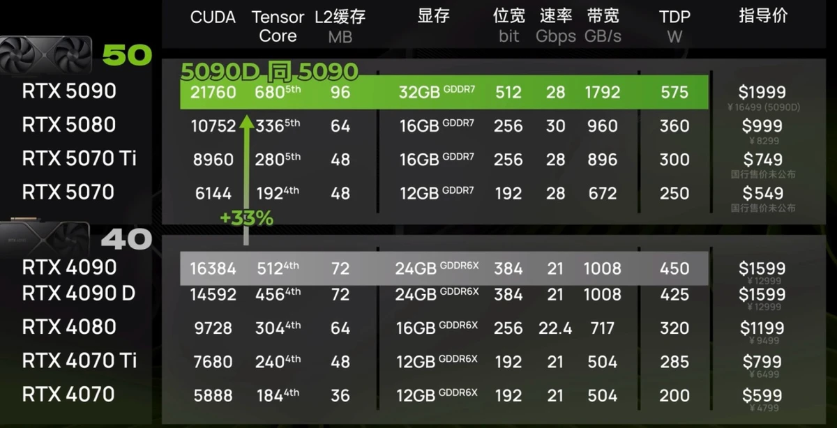 5090作为消费级最强显卡,这一代弟中弟好像并没有跟上一代那样低人一等,各项指标都是相差无几,与上一代均有30%的提升。