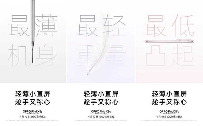 了解更多关于全新OPPO Find X8系列机身设计与技术突破的产品信息,敬请关注OPPO官方微博。从极致轻薄的机身工艺到沉浸式直屏体验,OPPO正以技术创新持续引领移动终端的发展方向。4月10日19:00,与全球用户一同见证Find X8s小直屏旗舰的惊艳登场。