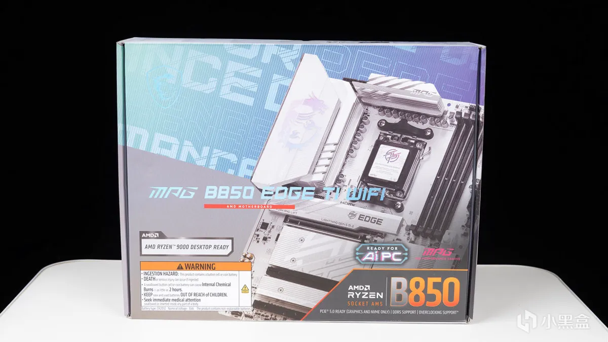 最终敲定微星这款MPG B850 EDGE TI WIFI刀锋钛,包装正面露出了半截主板渲染图,型号字体带有镭射效果,下方则标注一些关键信息和卖点。