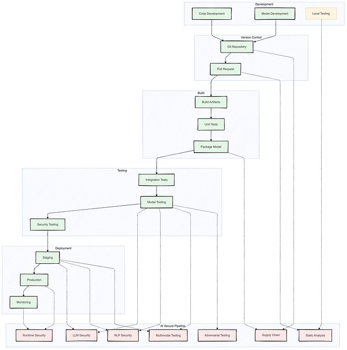 将AI安全集成到DevSecOps管道中,确保从开发到生产的持续有效性。以下关键管道阶段将AI安全嵌入到CI/CD工作流中: