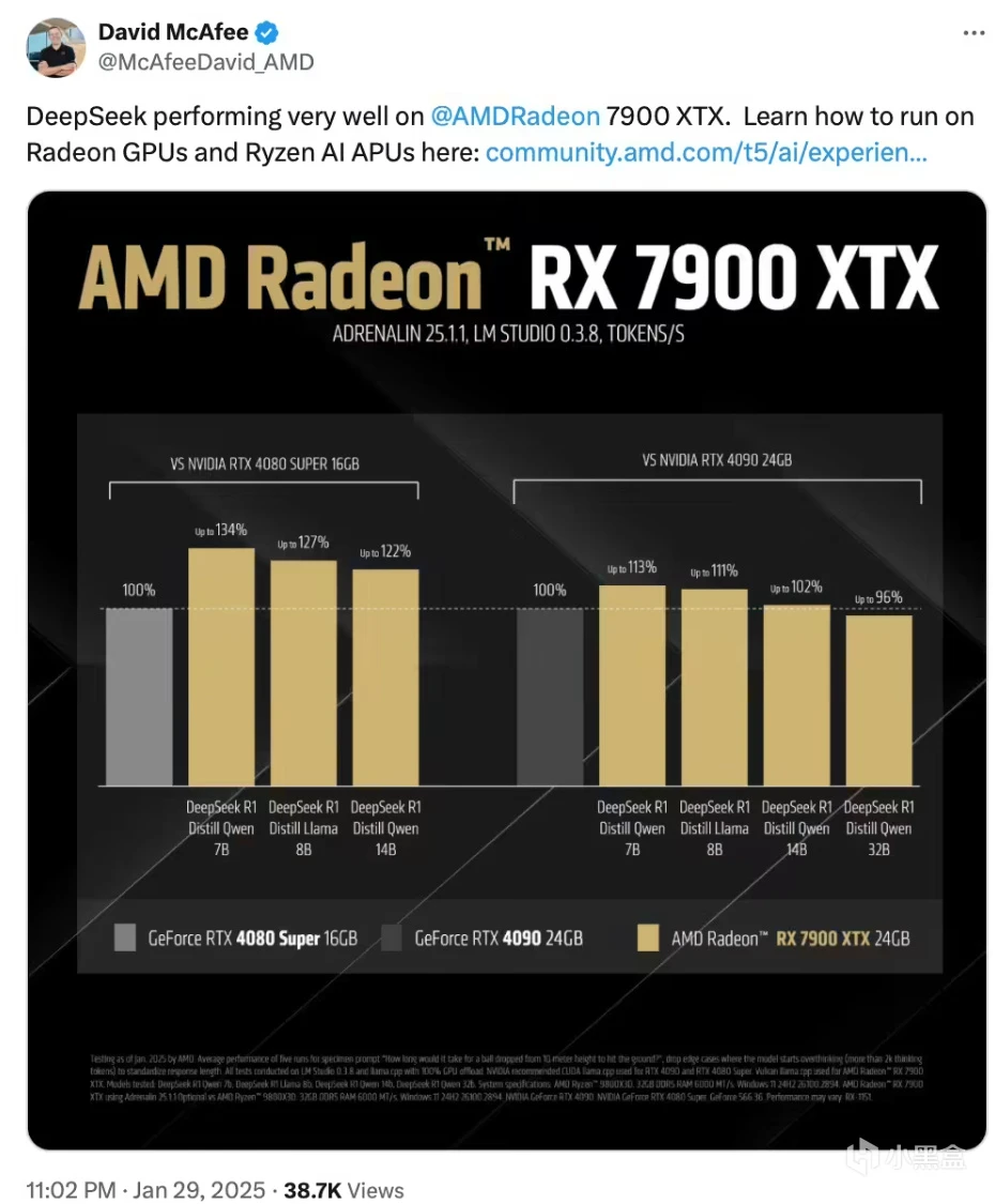 公司全球副总裁David McAfee日前在X平台发布重磅性能对比图,显示Radeon RX 7900 XTX显卡在DeepSeek-R1 AI模型测试中实现突破性表现: