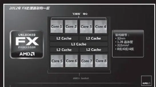 说了这么多打桩机架构本身的信息,接下来一起看看实际产品的情况。“打桩机”架构的实际产品采用32nm SOI工艺制造,总共拥有12亿晶体管,核心面积315平方毫米,每模块二级缓存为2MB,三级缓存为共享的8MB。这些规格参数和“推土机”架构的产品都基本相同。目前AMD推出的采用“打桩机”架构的具体产品有FX-8350、FX-8320、FX-6300和FX-4300四款,其余还有诸如FX-8300、FX-6350等暂时没有零售产品出现。所有的采用“打桩机”架构的处理器都支持双通道DDR3 1866内存,采用AM3+接口。内置四核模块到双模块不等,核心数量也从八个到四个不等。