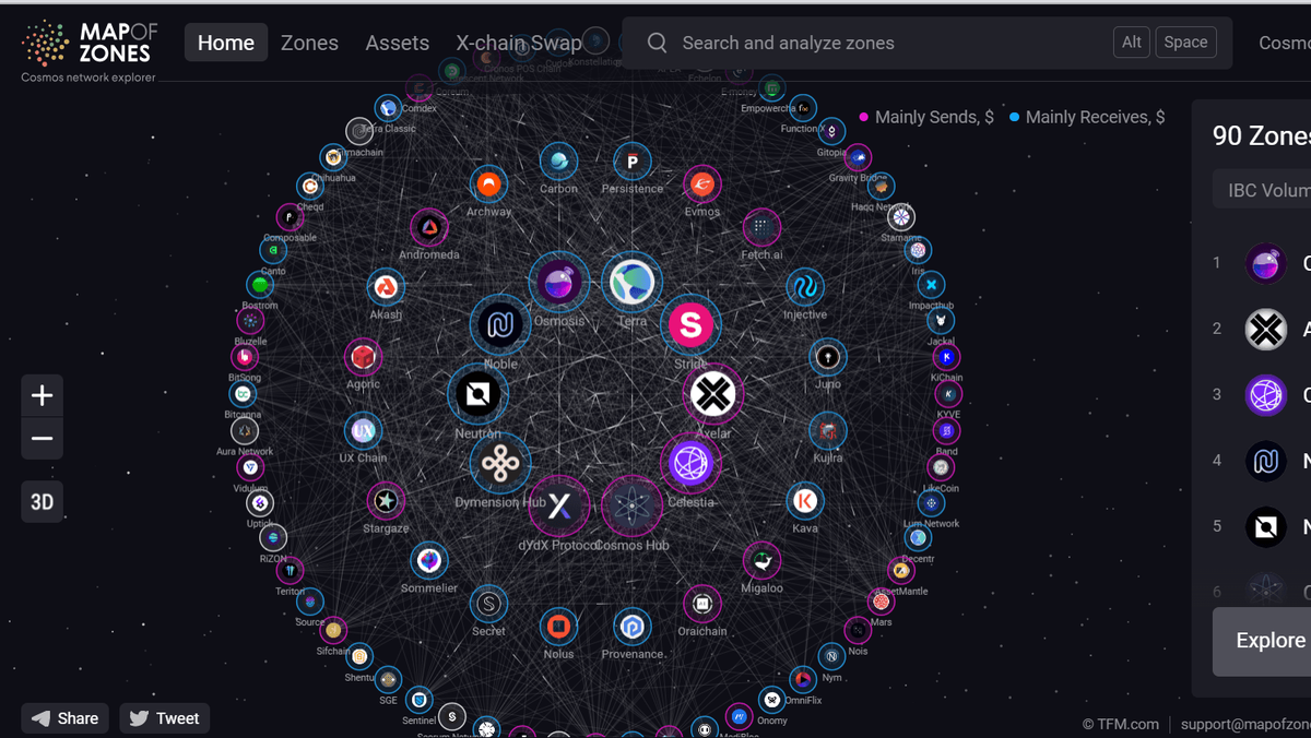 Babylon 链是构成更大的 Cosmos 互连区域网络的大量互连区块链之一。Babylon 通过比特币的安全保障帮助提高这些网络中的许多网络的安全性,而其长期目标是尽可能多地扩展到 Cosmos 内和生态系统外的链,例如 Ethereum 等网络。(图片来源:截图来自 区域地图网站)