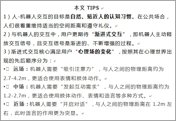 那么,人际交往中的距离和礼仪规则是否适合人-机器人交互?如何将这些规则提取转化,形成适合机器人表达的方式?这是需要深入思考的问题,为此我们做了研究和验证。