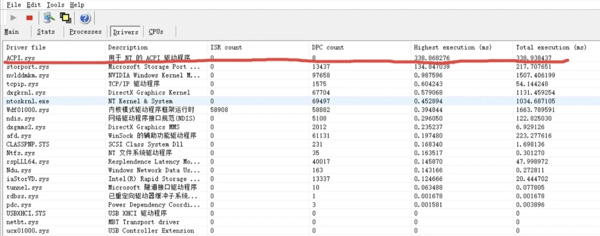 3.使用LatencyMon软件(CPU中断检测软件)检测到ACPI.sys(电源管理系统程序)或storport.sys(硬盘驱动程序)异常项。