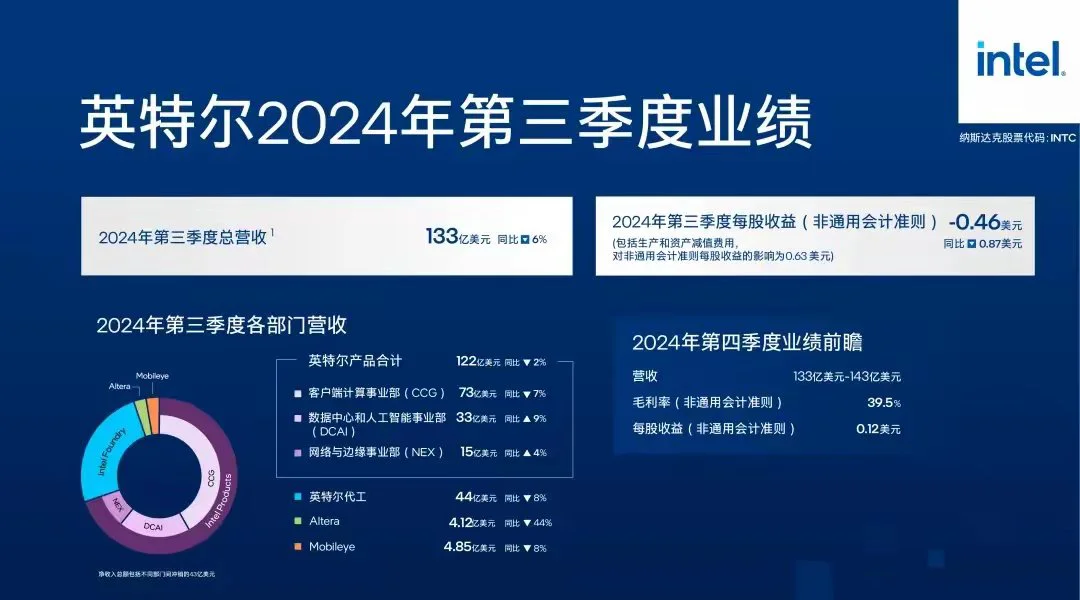 与此同时,11 月初 intel 就发布了自己第三季度的财报,总营收 133 亿美元,约合人民币 947 亿元。同比下降了 6%,环比提升 4%。
