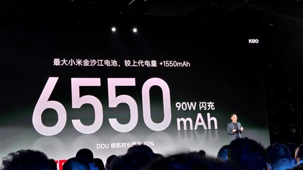 据介绍,REDMI K80搭载6550mAh电池,相比于上代增加了1550mAh,DAU续航时长提升了40%,比Pro版本的电池容量也更大,同时还支持90W闪充。