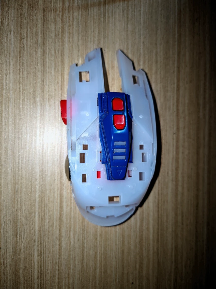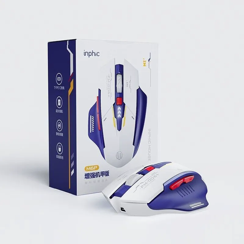 英克菲机甲有线鼠标以其独特的机甲风格设计脱颖而出。鼠标整体呈现蓝白色调,正面配有品牌logo和型号标识,给人一种怀旧而又不失现代感的视觉效果。
