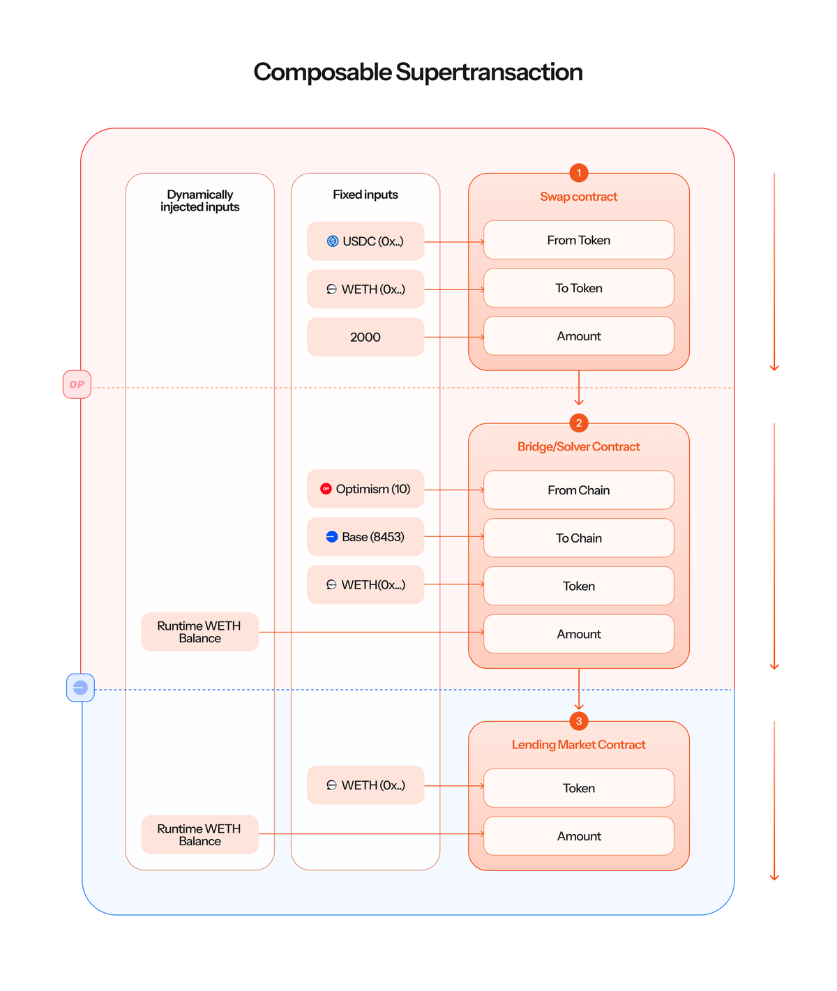 例如,在链 A 上交换代币时,确切收到的金额(可能因滑点而有所不同)可以动态用作桥接到链 B 的交易的输入,而后在链 B 上收到的确切金额(在桥接费用之后)可以用于链 C 的借贷存款——这一切均在单个用户签名下进行。