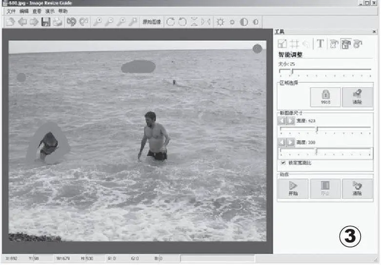 打开要进行缩小处理的照片,在界面右侧单击“智能调整”按钮进入智能调整界面,先单击“安全”按钮,并把照片中需要保持原分辨率的对象全部选中。然后勾选“新图像尺寸”栏中的“锁定宽高比”选项,并向左拖动滑块,设定新照片的分辨率,完后单击“开始”按钮进行处理。处理完后,我们就得到了一张画面与原照片相似,但其中人物却非常突出的照片。最后单击右下角的“清除”按钮取消绿色选区,单击工具栏的“另存为”按钮将新照片保存即可(如图3)。
