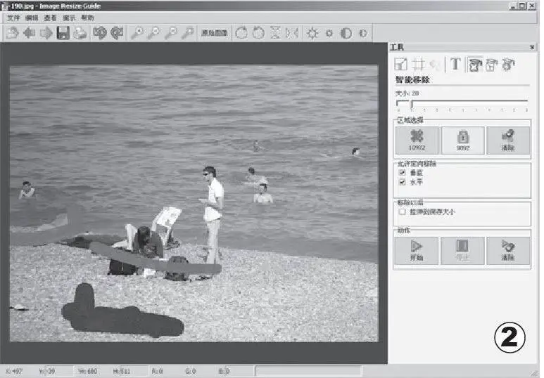 在程序界面单击工具栏中的“打开”按钮打开需要修复的照片,在界面右侧单击“智能移除”按钮进入智能移除界面。勾选“拉伸到保存大小”选项,然后在“区域选择”栏单击绿色的“安全”按钮,并在图像预览窗口把保护对象选中。接着单击“移除”按钮,把需要移除的对象涂成红色,最后单击“开始”按钮,即可把照片中的标记对象移除。本操作中,由于设置了画面中的保护对象,因此在移除对象的时候,遇到绿线就不再继续进行,使关键景物得到了保护(如图2)。