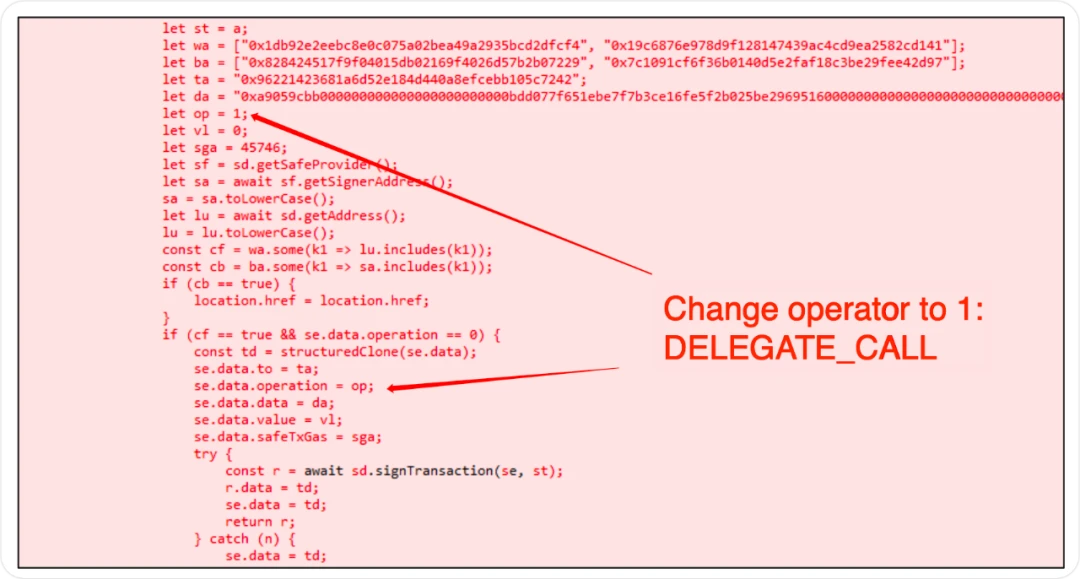 如上图所示,JavaScript 脚本修改了构造交易的过程,替换 CALL 交易到 DELEGATE_CALL,从而顺利完成 safe 合约的恶意升级,接管钱包。