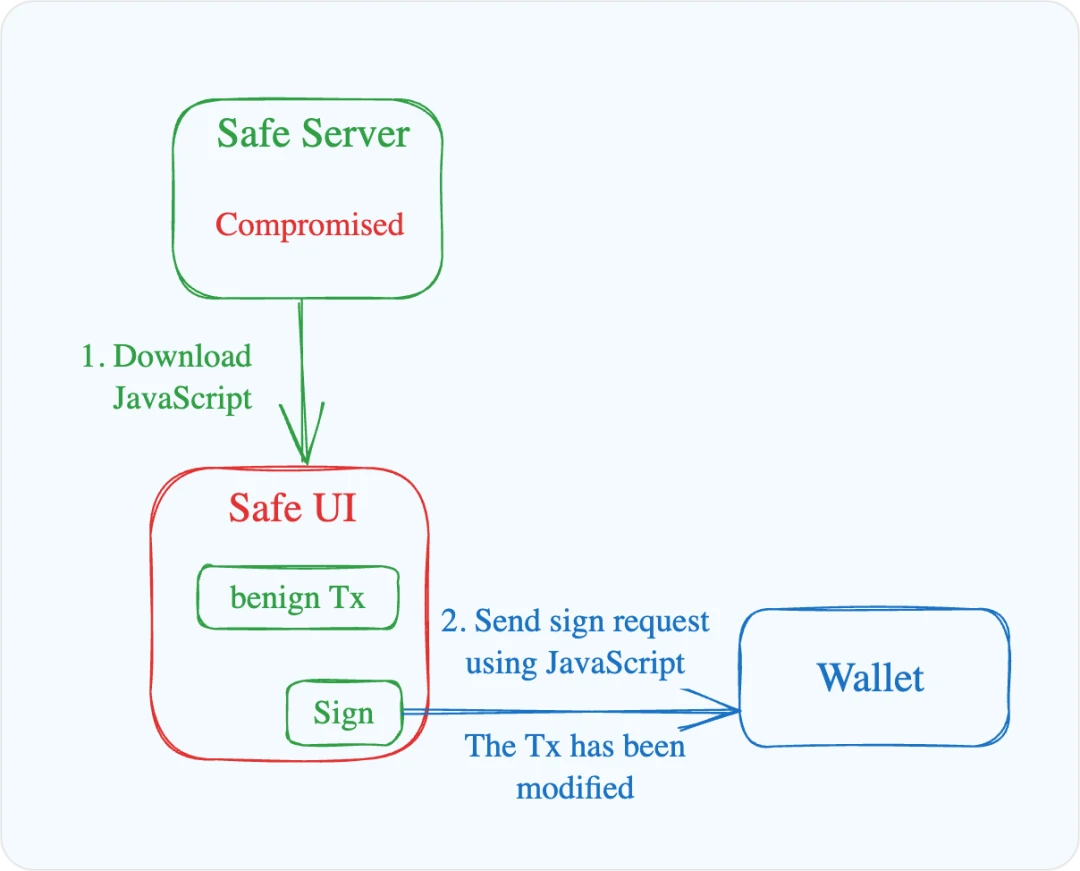 如果攻击者可以替换 Safe{Wallet}服务器上的文件(如 JavaScript),那么最终在钱包上签名的交易不是在 UI 上看到的合法交易,而是被替换掉的交易。