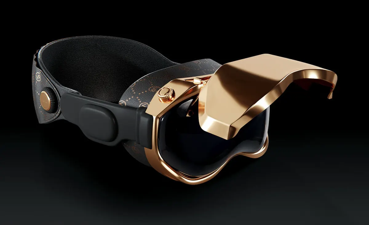 而这一次高档Apple Vision Pro 在设计上,包含Vision Pro 的旋钮、边框在内,都镀上了18K 金,同时还额外替产品加装了以福特的翻盖眼镜、 Gucci 滑雪面罩为灵感的保护盖 ,当然表面也同样镀上18K 金。