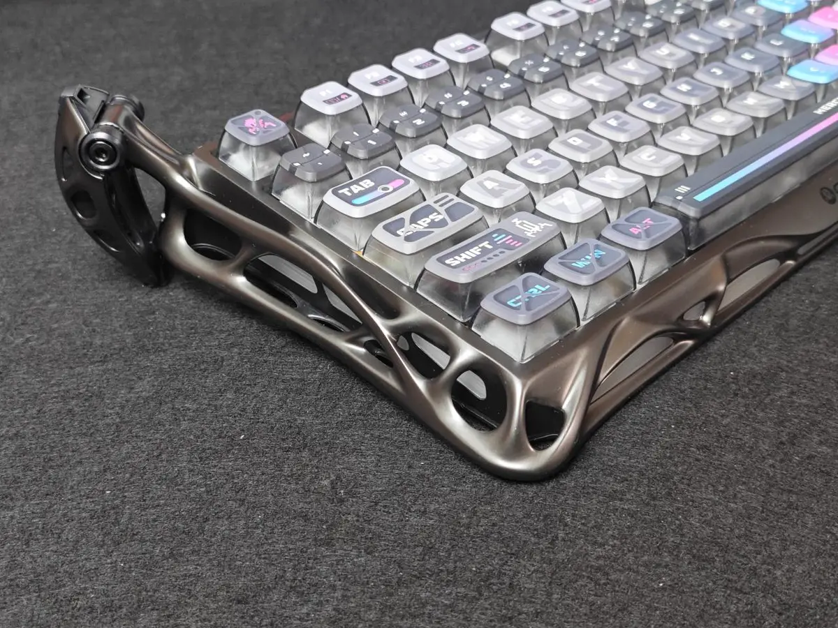 拿到手的第一眼,键盘的外框绝对足够吸引眼球。它的外框采用铝合金压铸工艺技术,打造出了一个非常个性的镂空框架。不规则的曲面线条,让键盘看上去仿佛一头披着外骨骼的甲虫。
