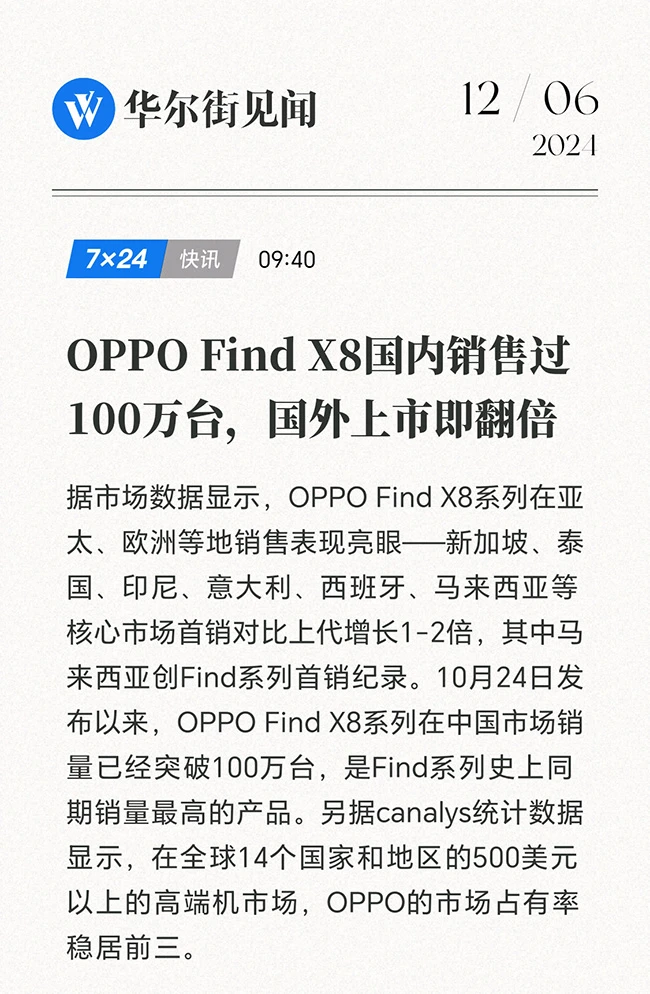 距离OPPO Find X8系列发布已经快两个月了,自从该系列手机开售以来,在国内和国外市场均获得不错的销量和强烈的市场反响。其中在国内市场目前销量已经突破百万台,成为了Find系列历史上同期销量最高的产品。