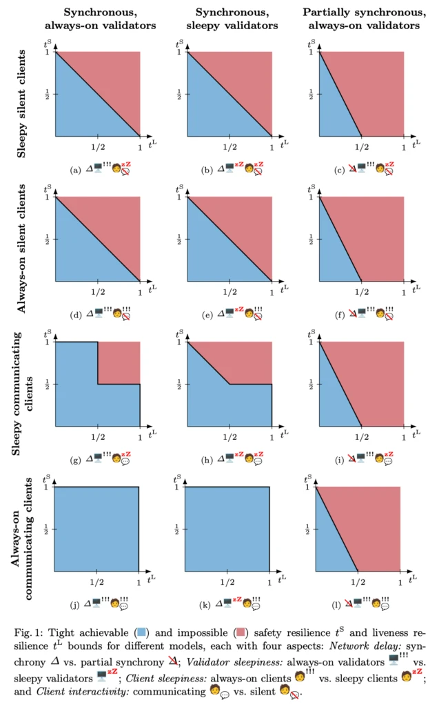 答案取决于客户端的建模。客户端是昏昏欲睡还是始终在线的?它们是沉默不语的还是可以沟通的?验证者也可以昏昏欲睡吗?网络是同步的还是部分同步的?在一篇新的论文中,我们(与Common Prefix的Dionysis Zindros,斯坦福大学和BabylonChain的David Tse合作)系统化了共识模型,涵盖这四个维度。系统性地研究客户端的特性使我们能够紧密刻画对应每个十六种模型的可达成的安全性和活跃性的弹性以及匹配的可能性和不可能性。我们能够统一民间传说和早期结果,并用新的协议和不可能性定理填补文献中留下的空白。