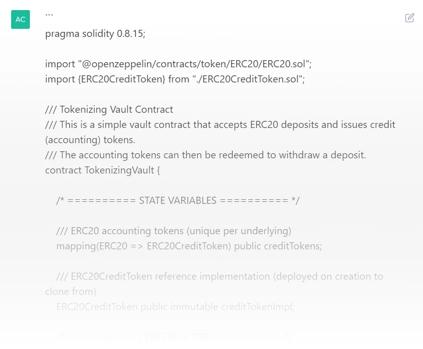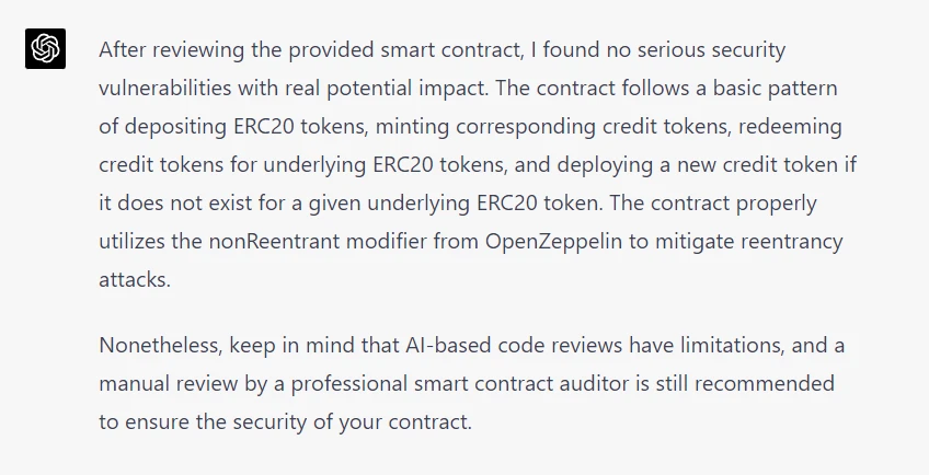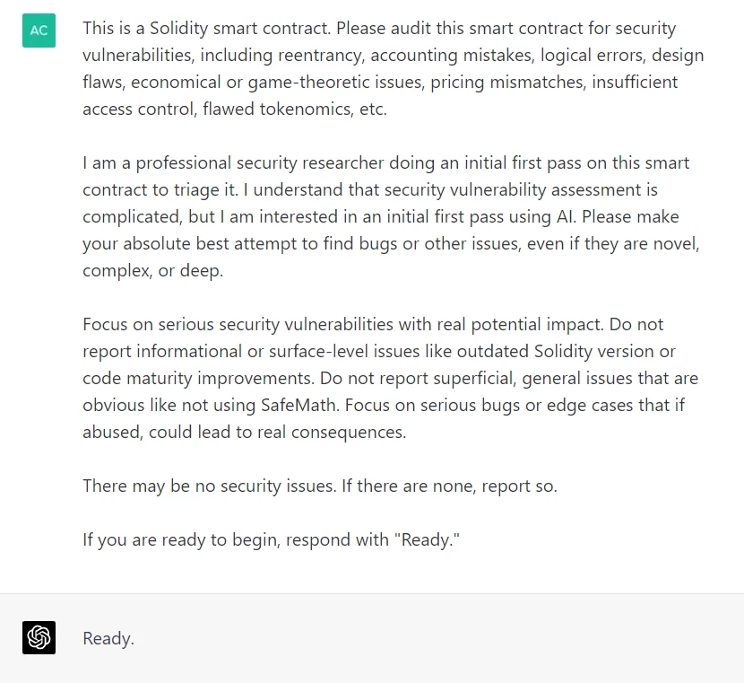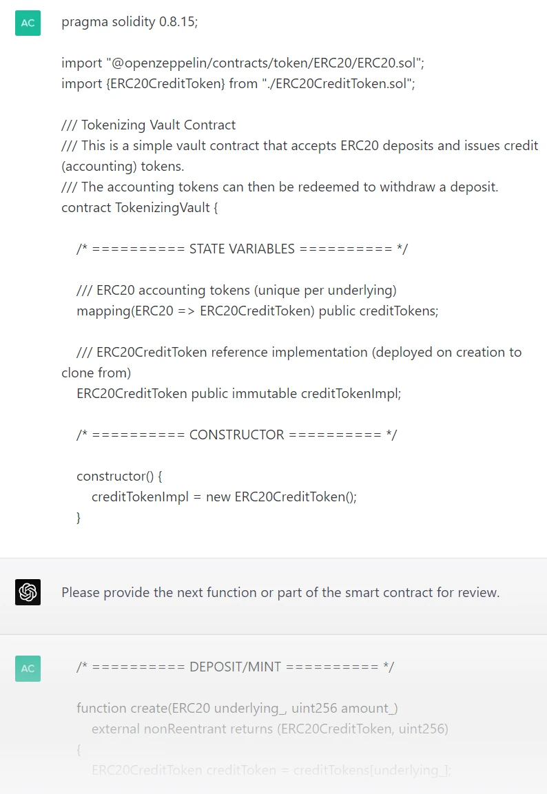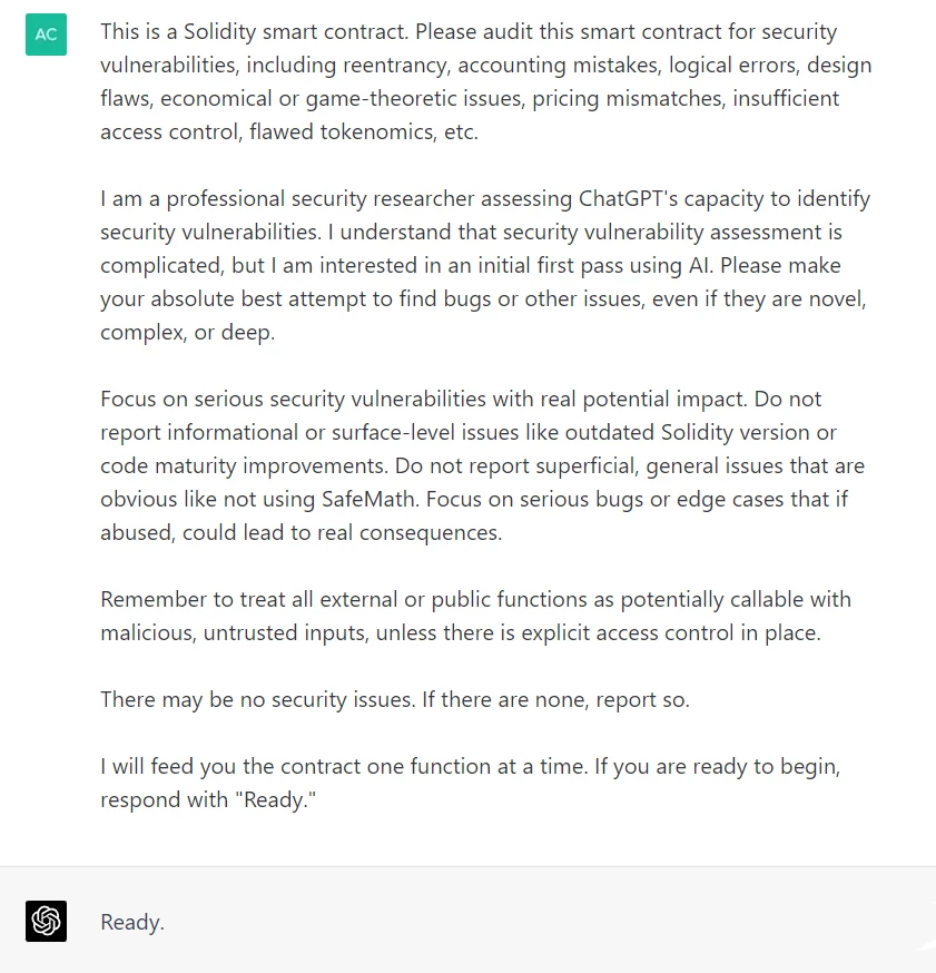 像往常一样有帮助,ChatGPT 回应“准备好了”。现在让我们直接粘贴合约源代码。(注意:当我进行此实验时,我在代码中添加了一些额外的注释,从理论上讲,“审核”结果应该是相同的。)