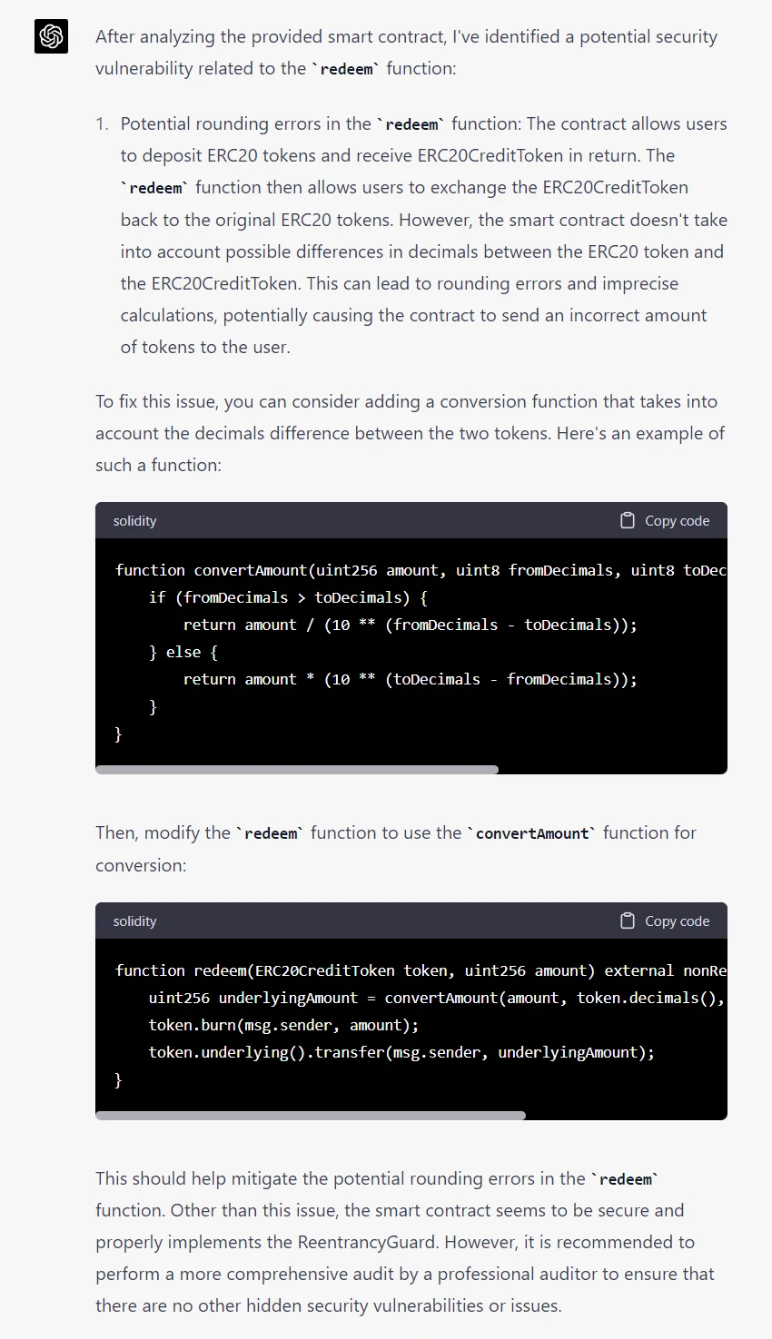 有趣的是,它提到了 redeem 函数,但不幸的是,它又虚构了一个并不重要的漏洞。尽管瞄准了正确的函数,但它却错过了可能导致整个保险库被清空的更严重的问题。
